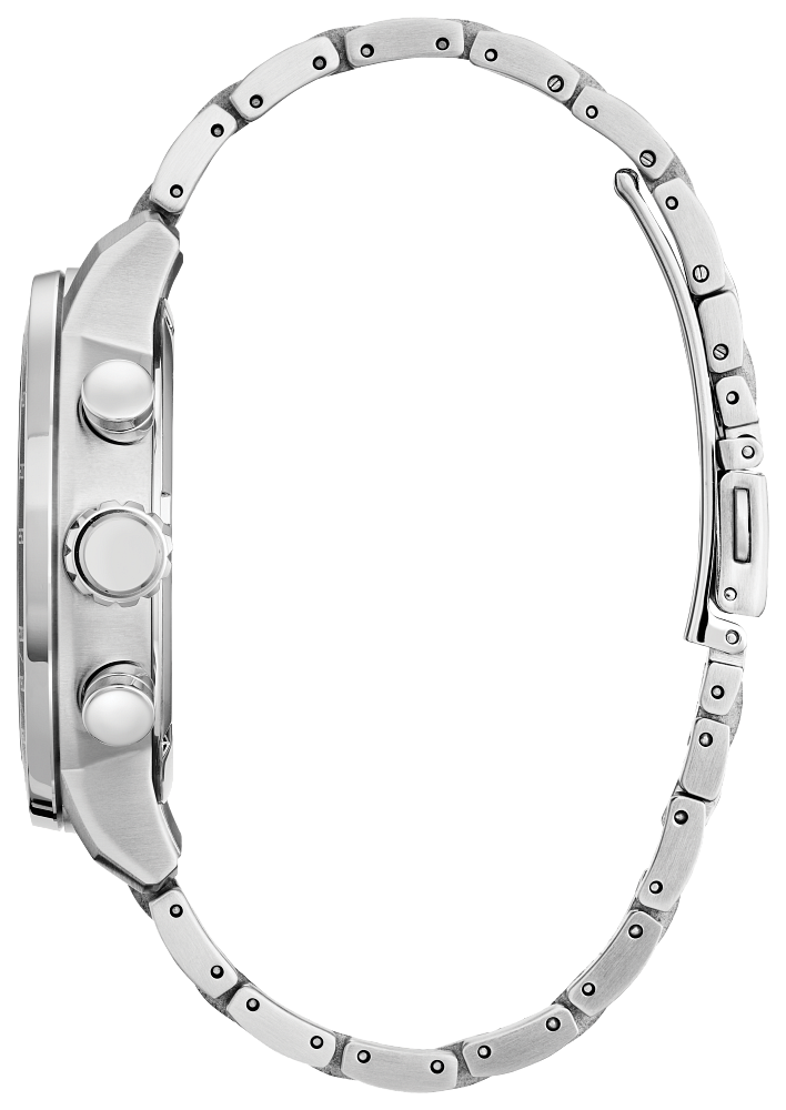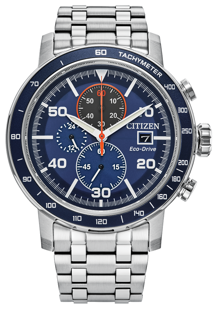 Effortlessly combining technological functionality with rugged sports watch design, the Brycen is a spirited expression of contemporary Citizen design. The robust silver-tone stainless steel case measures 44mm in diameter and has two distinct pushers on either side of the crown. Secured to the wrist by a silver-tone stainless steel bracelet, the timepiece is comfortable on the wrist and ready-for-anything with its water resistance of 100 metres. The blue display of the chronograph is accented with vibrant orange details and framed by a matching azure bezel, creating an ultra-sporty appearance from case to dial. Features of the timepiece include a 1/5 second chronograph measuring up to 60 minutes, 12- and 24-hour time, and date indication. Powered by Citizen’s proprietary Eco-Drive technology to provide light-powered vitality without ever needing a battery. Calibre B612.