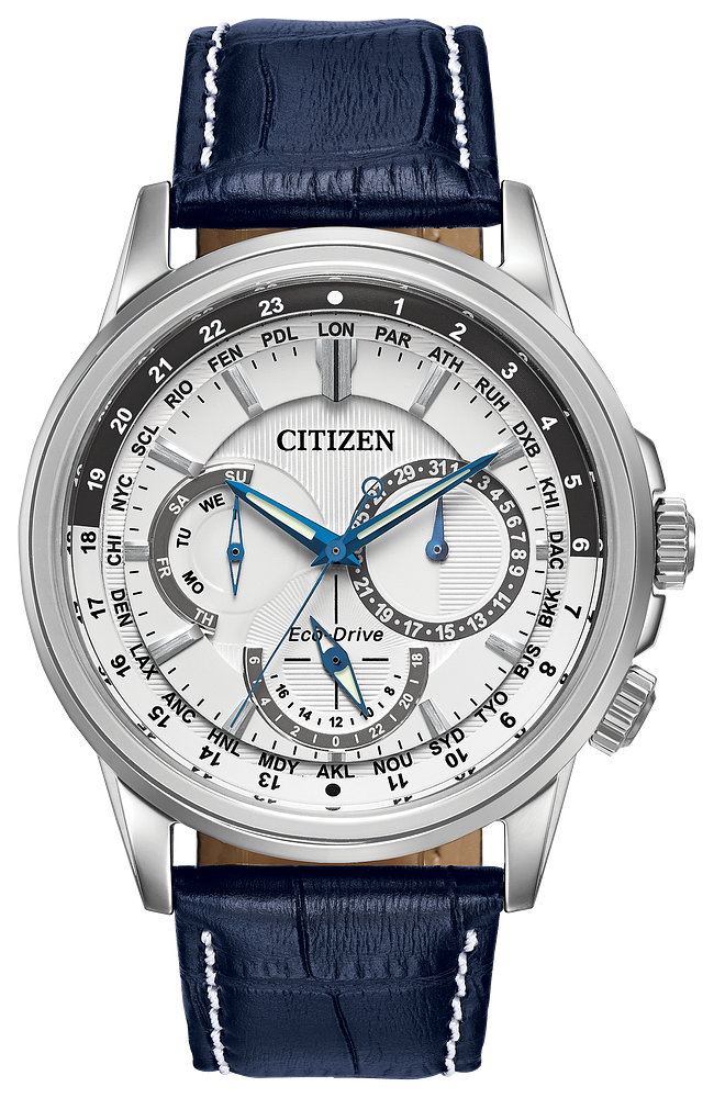 The CITIZEN® Calendrier reflects a timeless sophistication featuring 12/24-hour time, world time in 24 time zones and day/date. Shown in a stainless steel case with a dark blue leather strap and a white dial.
