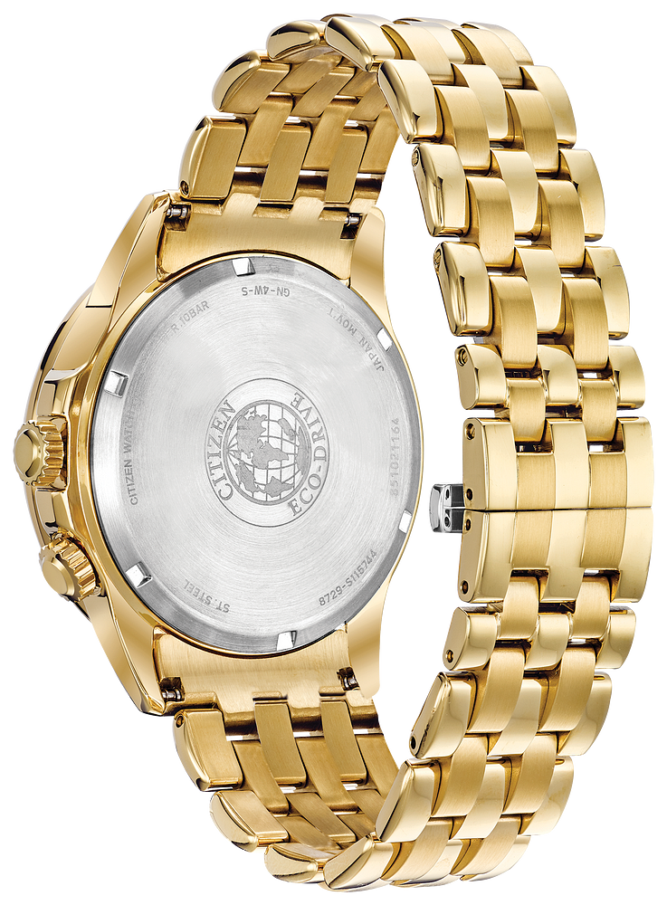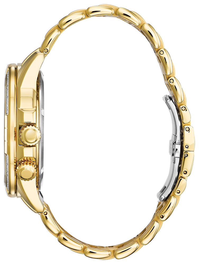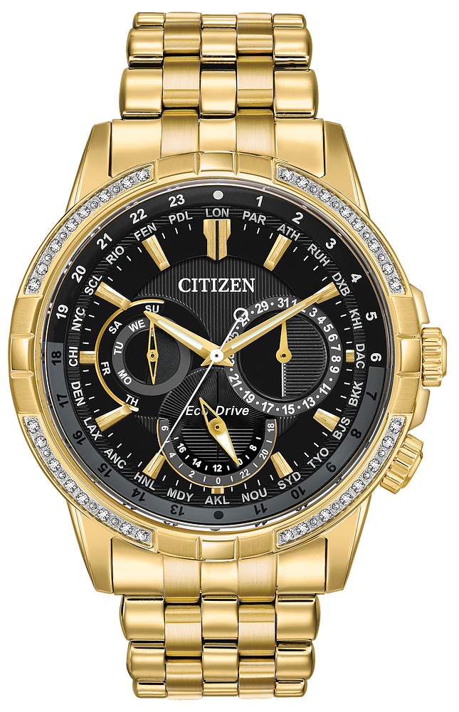 Bring sophistication to your day with the CITIZEN® Calendrier. This timeless watch features world time in 24 cities, 12/24-hour time, and day/date. It is shown here in a gold-tone stainless steel case and bracelet, with a diamond adorned bezel and black dial. Featuring our Eco-Drive technology – powered by light, any light. Never needs a battery.