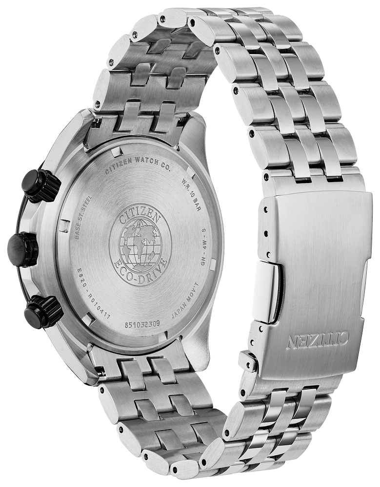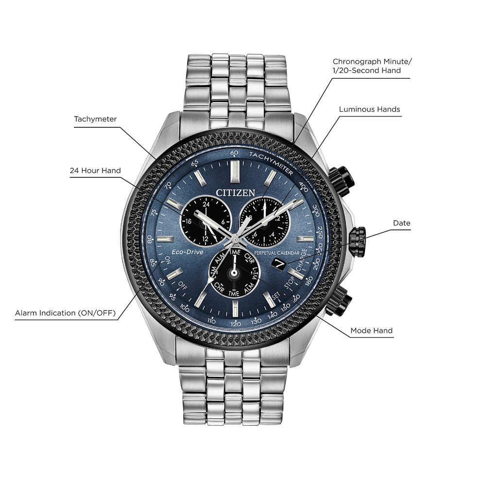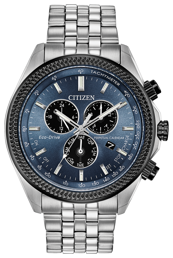 Taking it up a notch with the reinvented CITIZEN® Classic timepiece with a 1/20-second chronograph, perpetual calendar and dual time in a stainless steel case and bracelet completed with a blue-grey dial. Featuring our Eco-Drive technology – powered by light, any light. Never needs a battery.