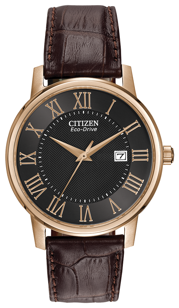 Drawing on design elements from classic timekeeping, this timepiece boasts oversized Roman numerals and a herringbone inspired dial pattern. With a rose gold-tone stainless steel case and a brown leather strap, this timeless design will be in fashion for years to come.