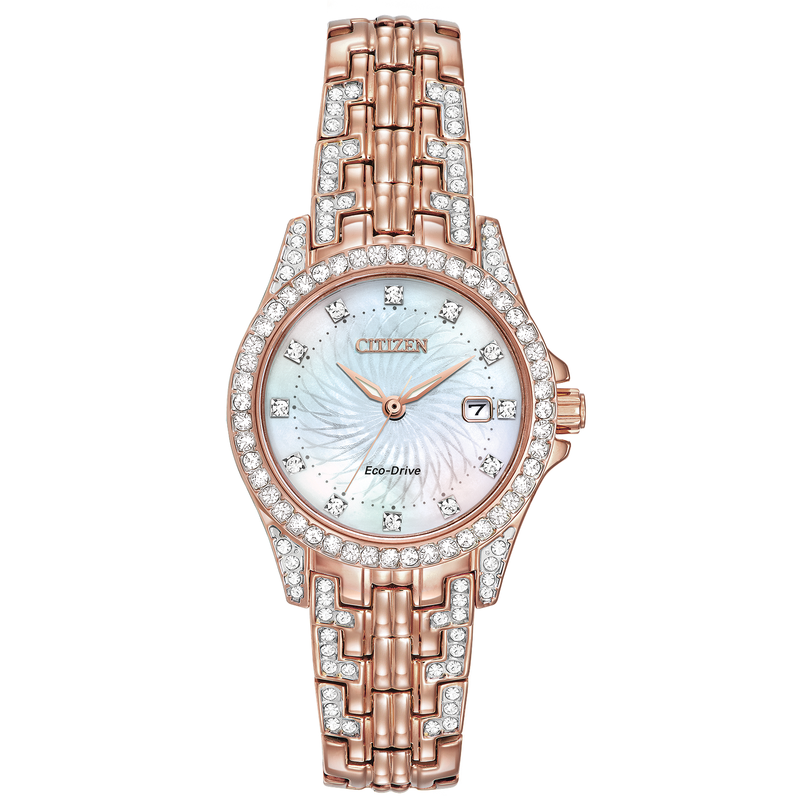 Classic lines with a hint of sparkle are hallmarks of this CITIZEN® Silhouette Crystal model that shines bright with crystals. Shown in pink gold-tone stainless steel with a white Mother-of-Pearl dial and date display.