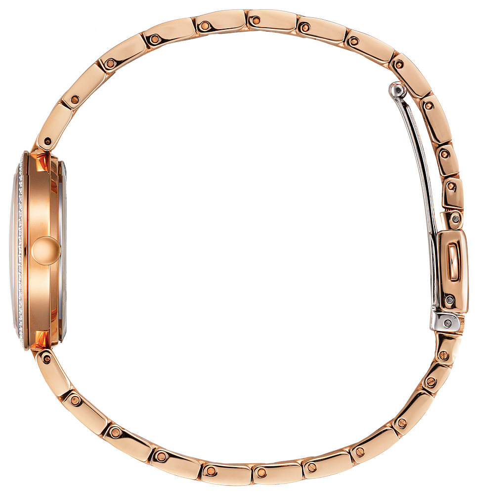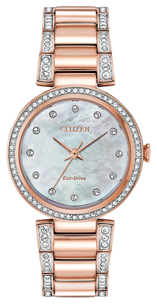 For an elegant accessory to complement every outfit, the Silhouette Crystal from CITIZEN® is a perfect choice. The Eco-Drive-powered timepiece features a pink gold-tone stainless steel bracelet, with crystals along both outside edges. The bezel and the Mother-of-Pearl dial feature additional crystals rounding out the look. The watch is an ideal choice for those looking to transition from day to evening looks without missing a beat.