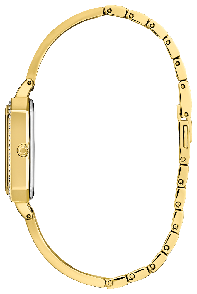 Elevate your look with the Citizen Silhouette Crystal ladies’ timepiece that features both a striking and elegant appearance. The slim, gold-tone bracelet band is surrounded by a sparkling crystal accented bezel with a black dial that exudes bold luxury. This three-hand women’s watch has a jewelry clasp with a push button and uses Citizen’s sustainable Eco-Drive technology to power itself by light. This stylish watch transitions beautifully from a day in the office to a night on the town and will add a touch of sophistication to your overall look.