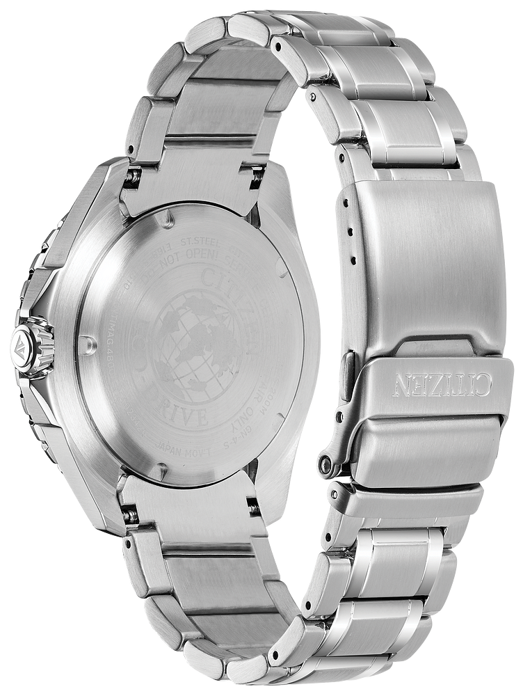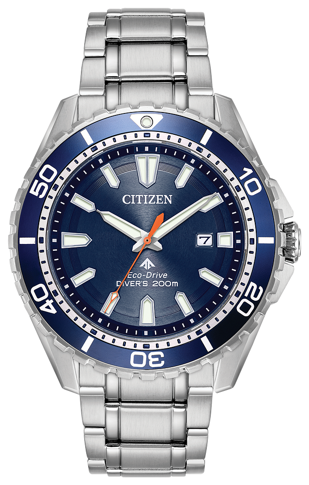 CITIZEN®'s PROMASTER Diver is the perfect ISO compliant timepiece for the bold seeking the thrill of a deep-sea challenge. Built with diving in mind, this timepiece is tough and durable. Shown in a stainless steel case and bracelet, the PROMASTER Diver features a one-way rotating elapsed-time bezel, a screw-back case and screw-down crown, and an anti-reflective crystal. Water resistant up to 200 metres.