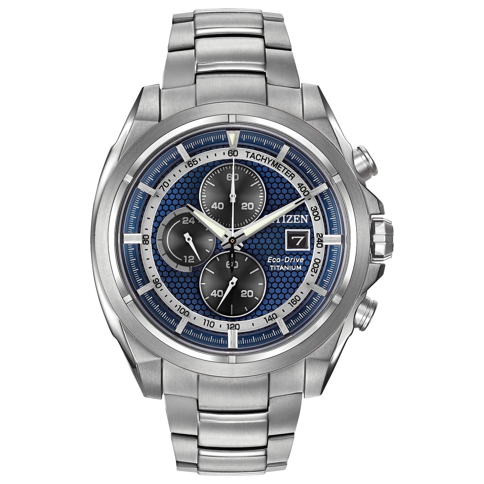 CITIZEN® combines this bold and sporty chronograph with light-weight super titanium creating a timepiece that is not only great looking but comfortable to wear. The blue dial with black chronograph wheels features bright colored accents. With titanium case and bracelet, 1/5th second chronograph measuring up to 60 minutes, 12/24-hour time, sapphire crystal and date.